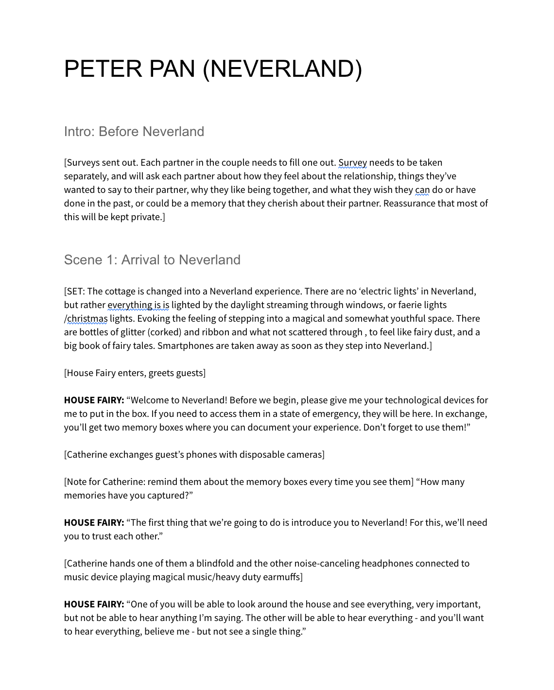 Aided by the resident House Fairy, guests are taken on a journey to keep up with the Lost Boys, escape the tricks of Captain Hook, explore the magic of their own imaginations, and ultimately deepen their relationship through connection, collaboration, and care.